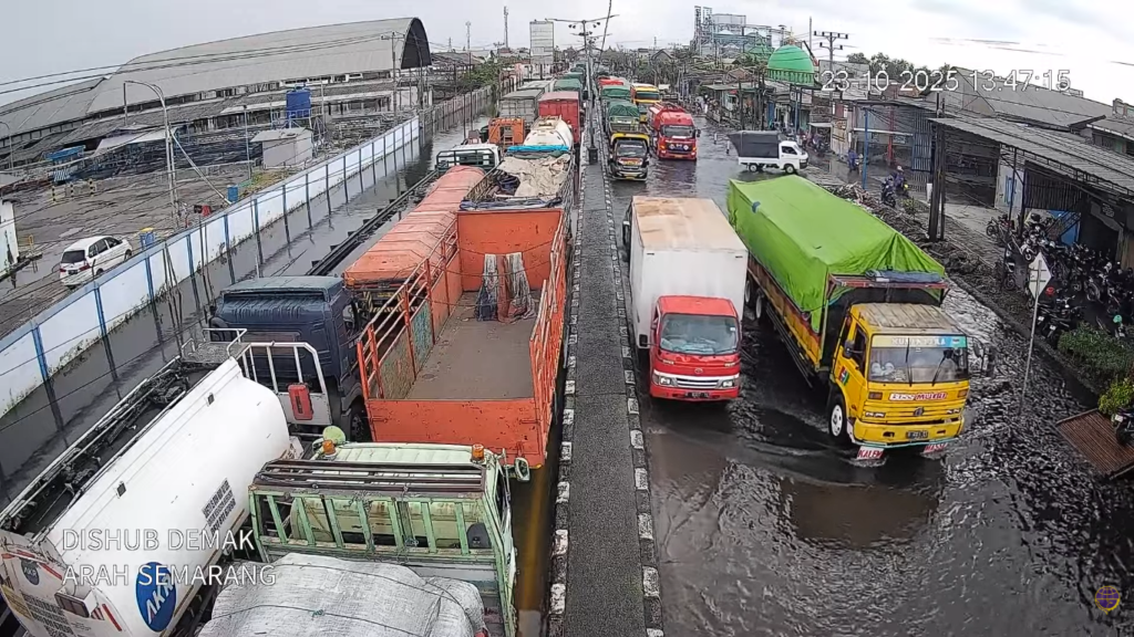 Demak, 24 Oktober 2025 – Jalur Pantura yang menghubungkan Kabupaten Demak dan Kota Semarang masih terendam banjir hingga Jumat siang. Genangan air yang mencapai ketinggian 30 hingga 60 sentimeter membuat arus lalu lintas dari arah timur menuju barat terganggu dan harus dialihkan ke jalur alternatif.