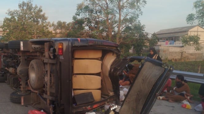 - Terguling: Minibus tersebut oleng tak terkendali dan akhirnya terguling di badan jalan tol.