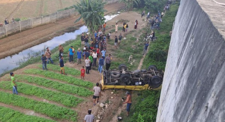 Truk tersebut jatuh ke bawah yang merupakan lahan kebun. Truk tersebut ringsek usai jatuh dari ketinggian sekitar 6 meter.