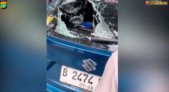 Dalam video yang beredar, terlihat kaca belakang mobil bernopol B-2474-BYF itu berlubang besar setelah dihantam helm pemotor. Pelaku sempat adu mulut dengan pengemudi mobil.